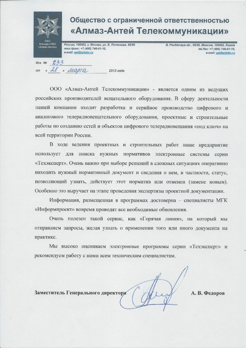 ООО «Алмаз-Антей Телекоммуникации», г. Москва, заместитель генерального директор А.В. Федоров: