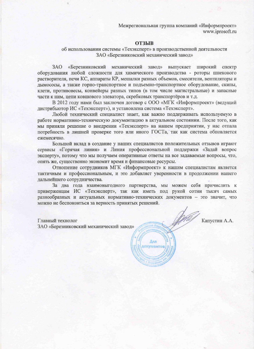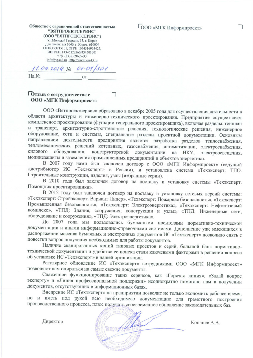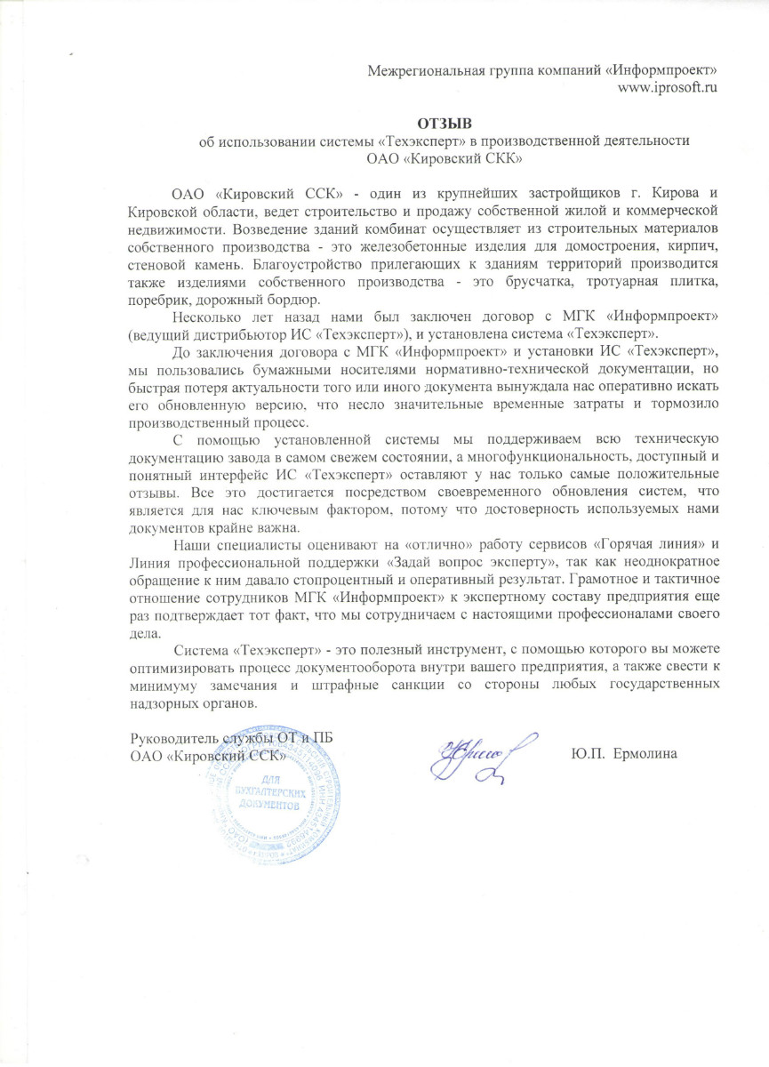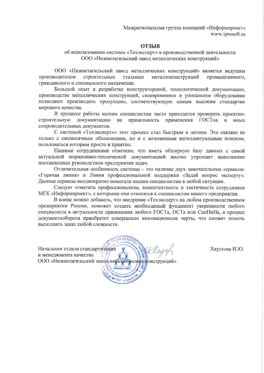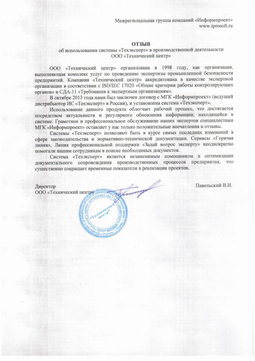 «Нам нравится обслуживание программ специалистами МГК «Информпроект», которое всегда происходит на достойном уровне, нравятся такие сервисы, как отраслевая газета для технических специалистов «Техэксперт», «Горячая линия» - возможность дополнительно заказать нужный документ по смежным отраслям».