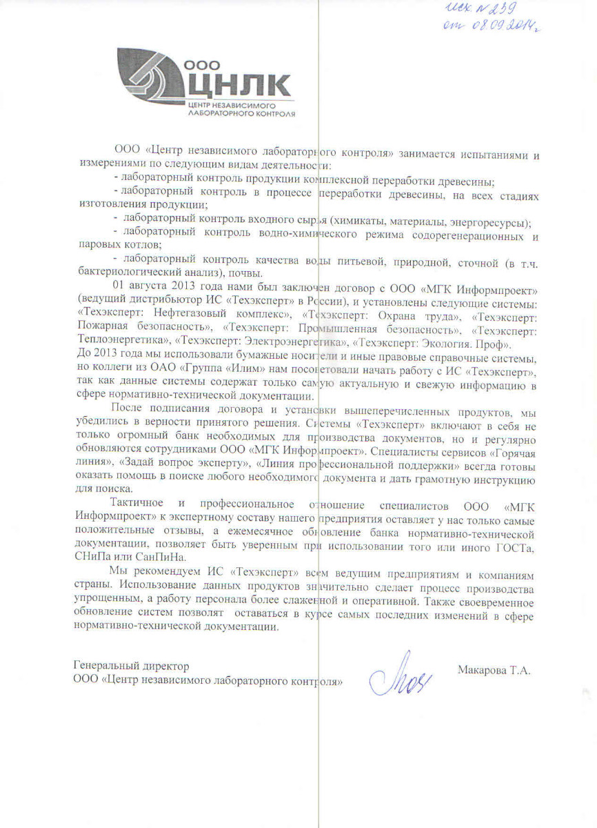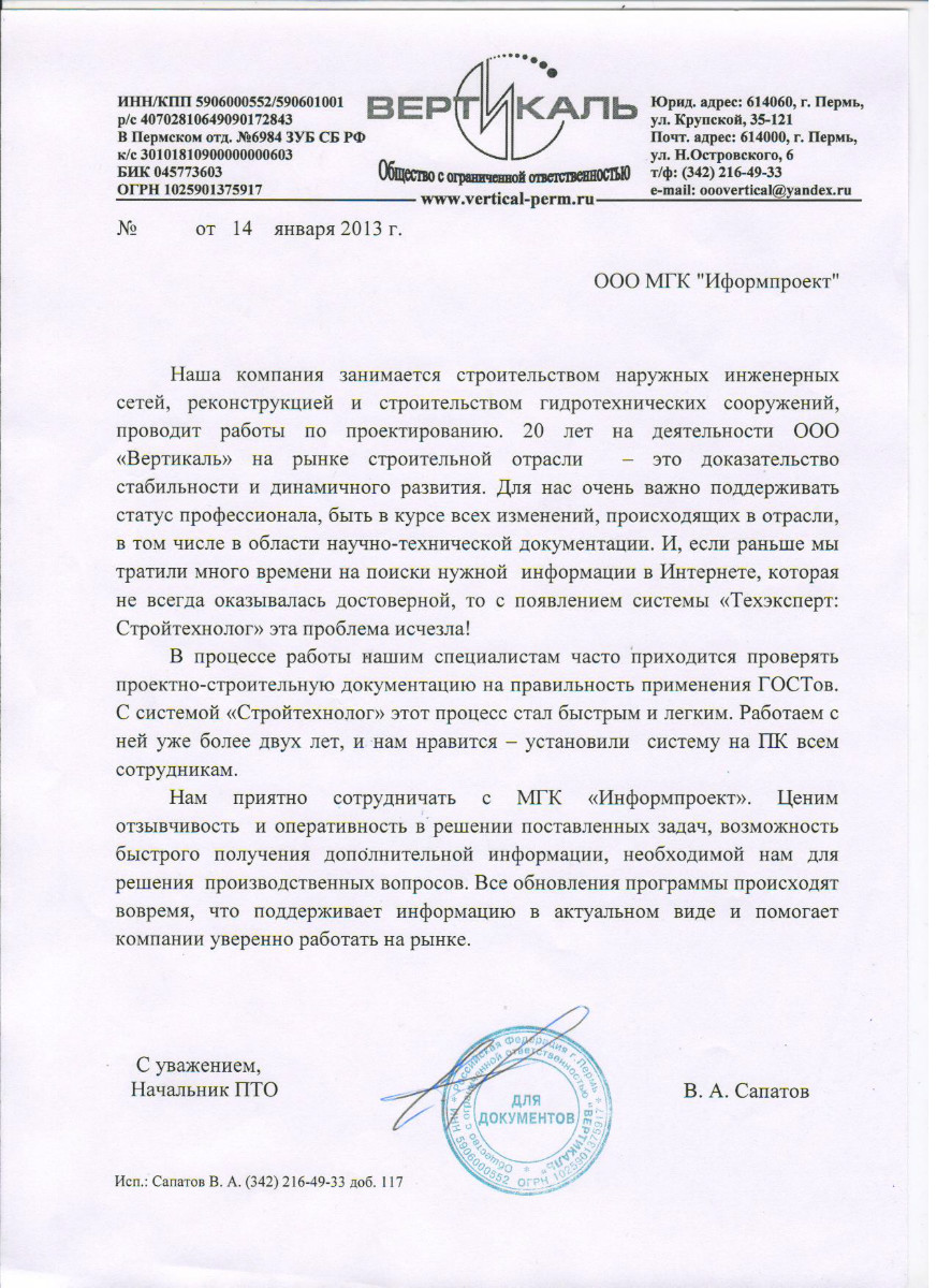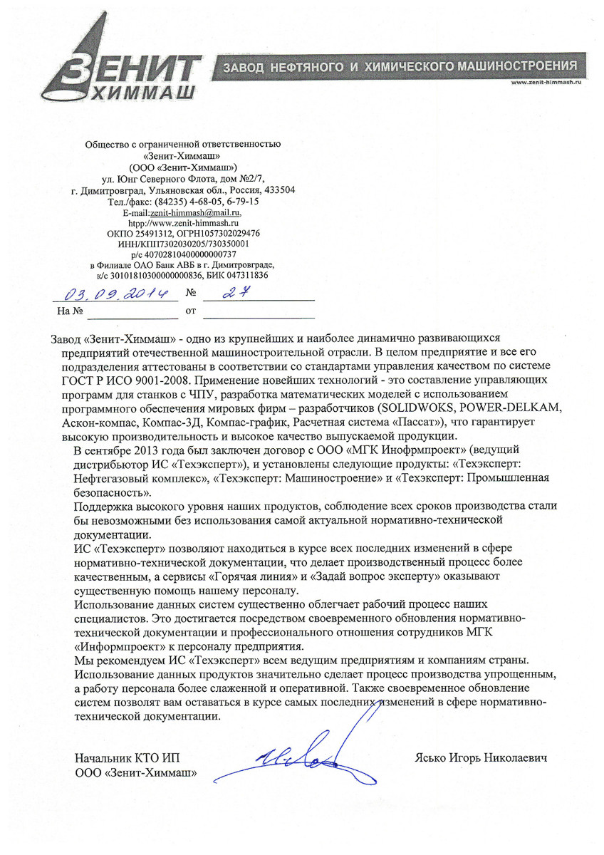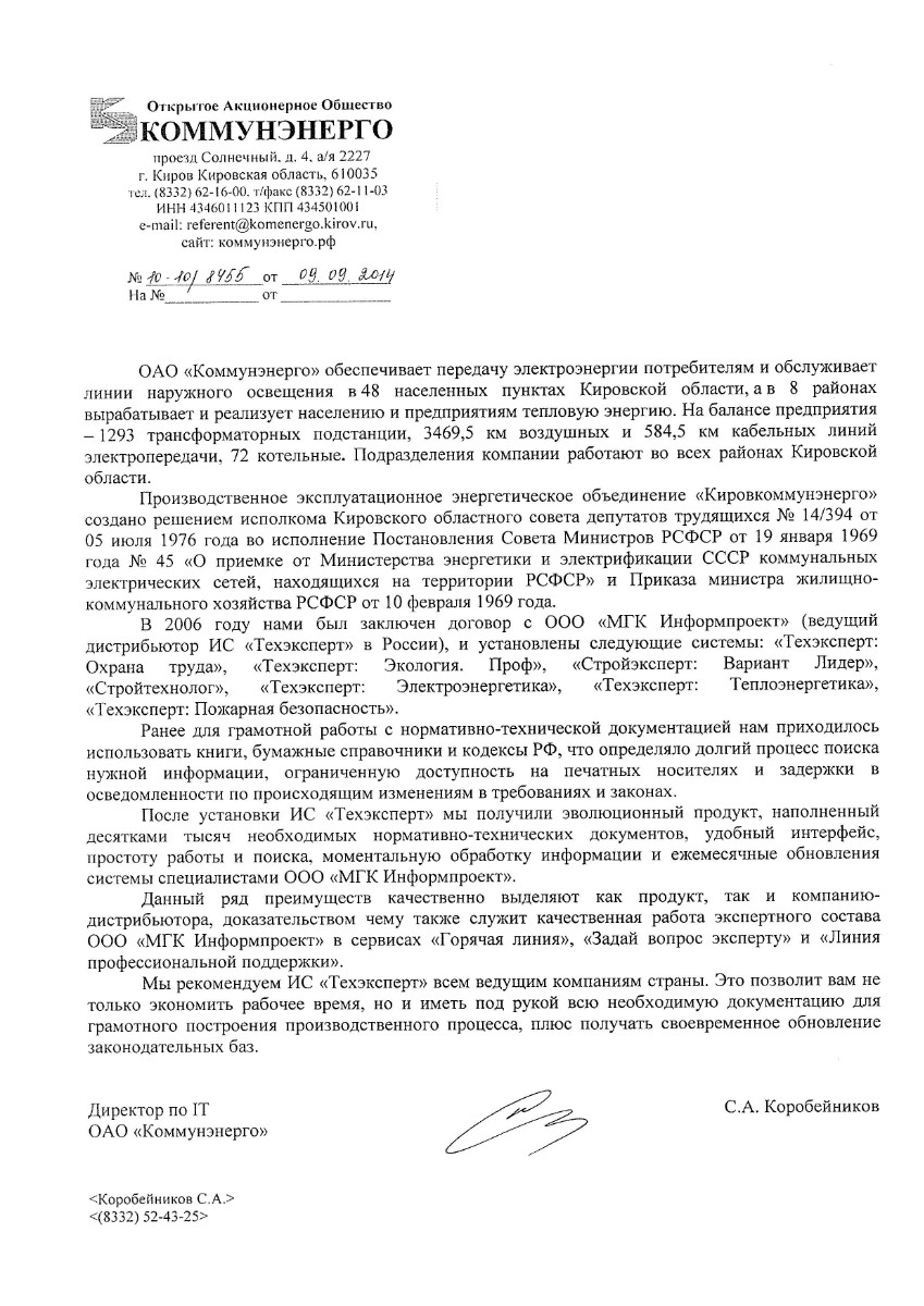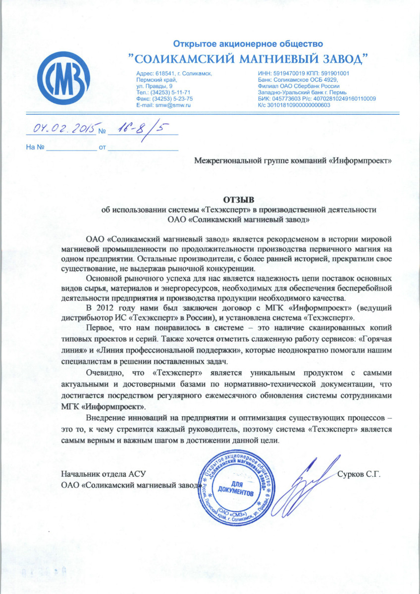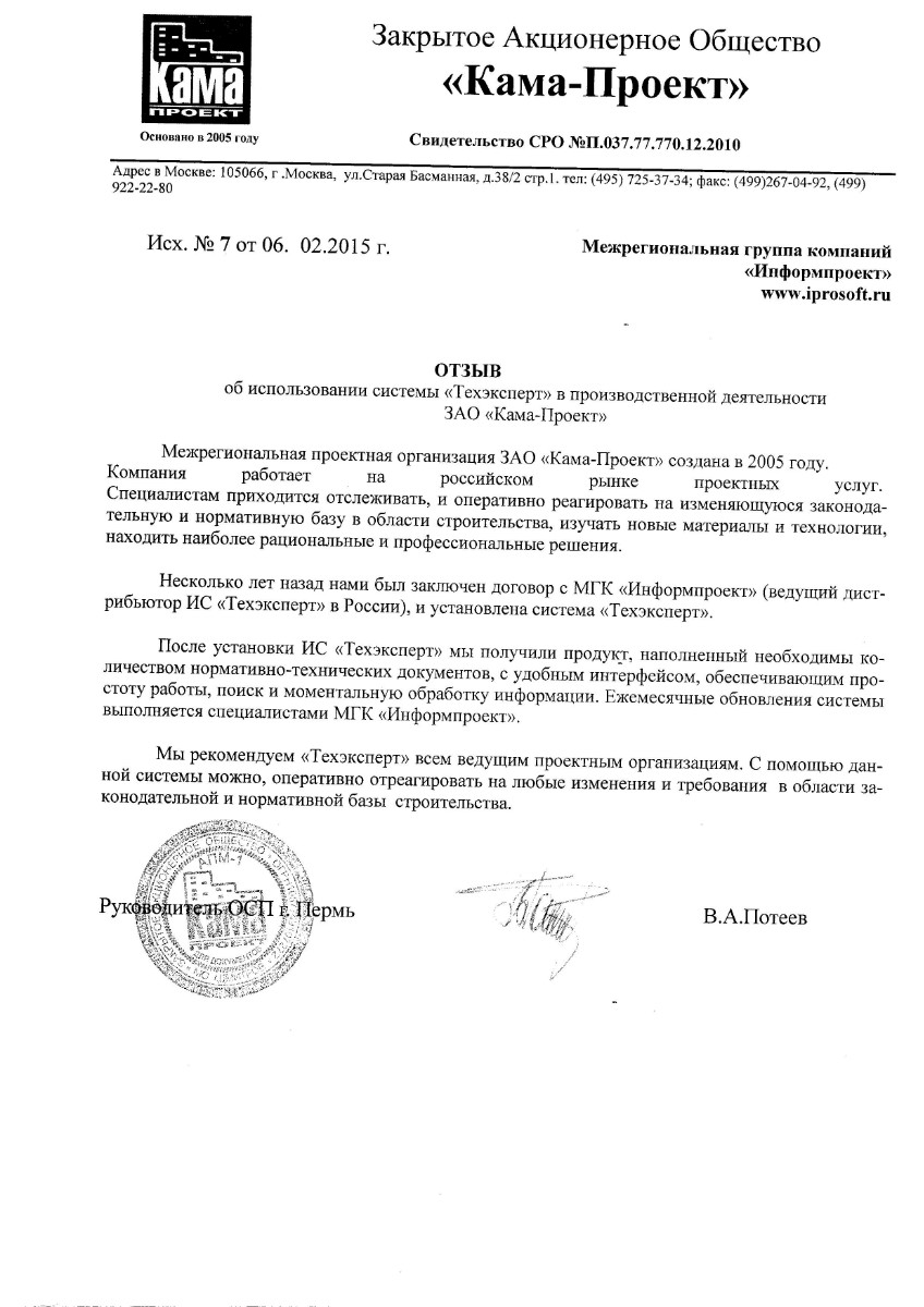 «Нам нравится обслуживание программ специалистами МГК «Информпроект», которое всегда происходит на достойном уровне, нравятся такие сервисы, как отраслевая газета для технических специалистов «Техэксперт», «Горячая линия» - возможность дополнительно заказать нужный документ по смежным отраслям».