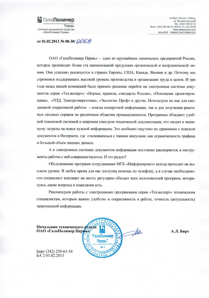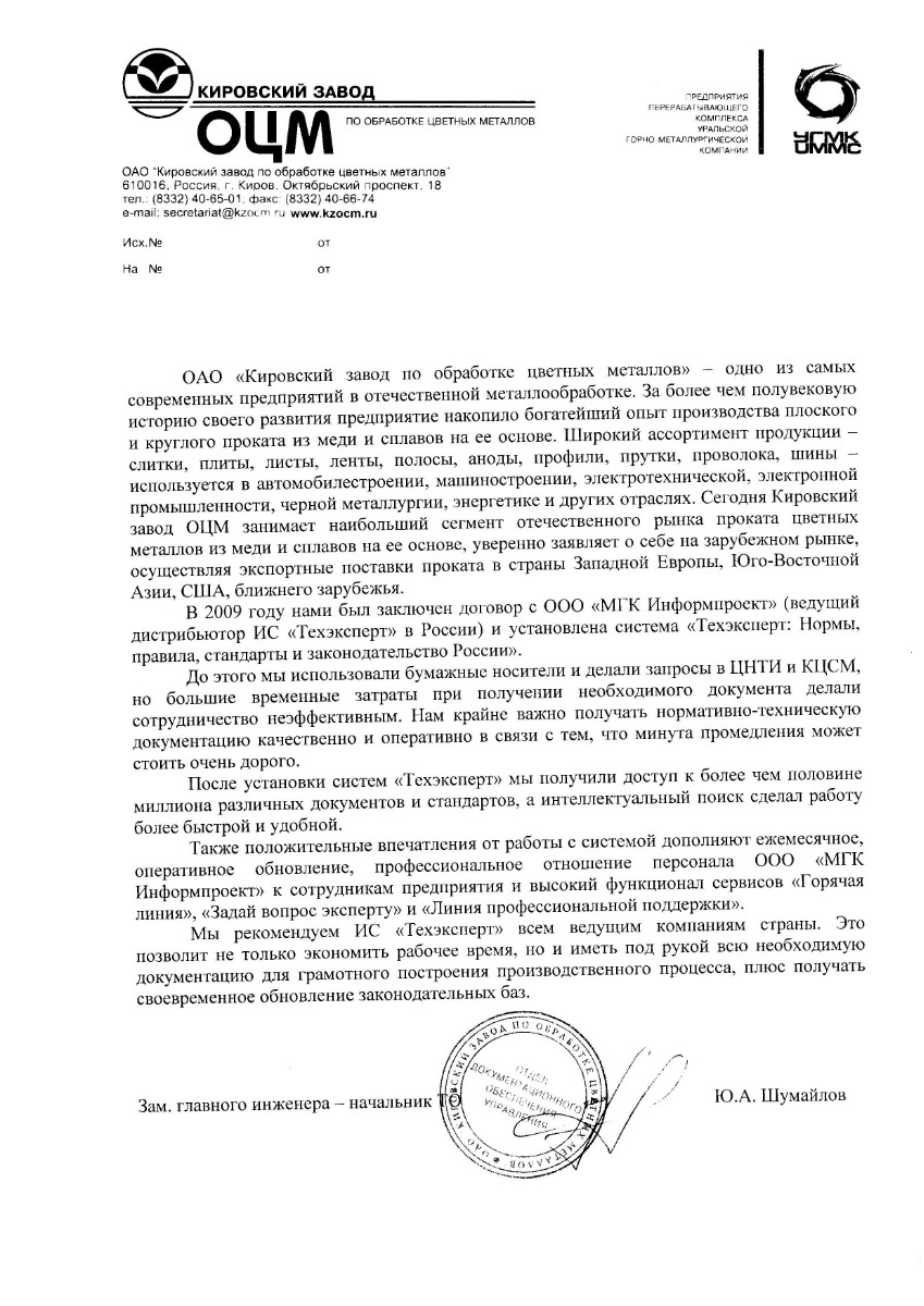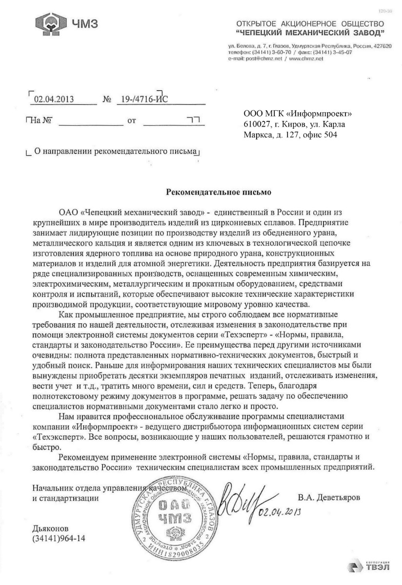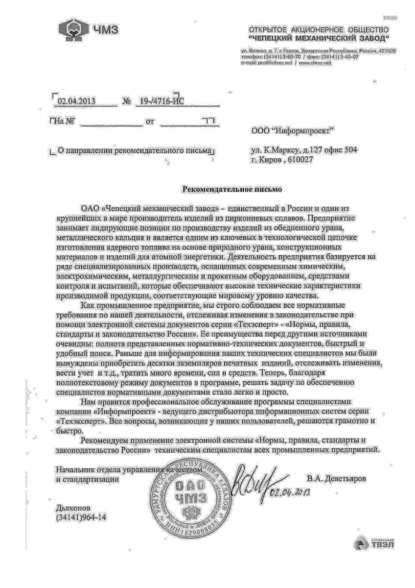 «Как промышленное предприятие мы строго соблюдаем все нормативные требования по нашей деятельности, отслеживая изменения в законодательстве при помощи электронной системы документов серии «Техэксперт» - «Нормы, правила, стандарты и законодательство России». Ее преимущества перед другими источниками очевидны: полнота представленных нормативно-технических документов, быстрый и удобный поиск».