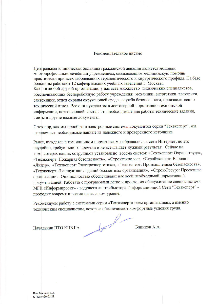 «ЦЕНТРАЛЬНАЯ КЛИНИЧЕСКАЯ БОЛЬНИЦА ГРАЖДАНСКОЙ АВИАЦИИ», г. Москва, начальник ПТО КЦБ ГА А.А. Блинков: