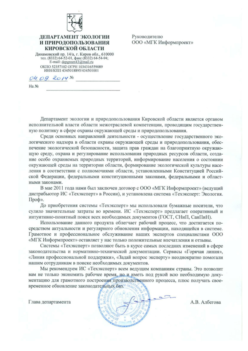 «Наличие программы помогает быстро и эффективно решать задачи по подборке документов по тем или иным вопросам, в том числе методик для разработки проекта ПДВ. «Экология. Проф» стала незаменима при разработке природоохранной документации (ПДВ, ПНООЛВ, разделы ОВОС) и инструкций. Нам нравится, что все документы представлены в последней редакции».