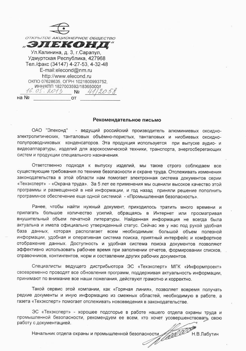 ОАО «Элеконд», начальник отдела охраны труда и промышленной безопасности Н.В. Лабутин