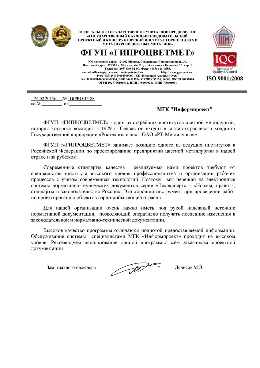 ФГУП «ГИПРОЦВЕТМЕТ», г. Москва, зам. главного инженера М.Э. Денисов: