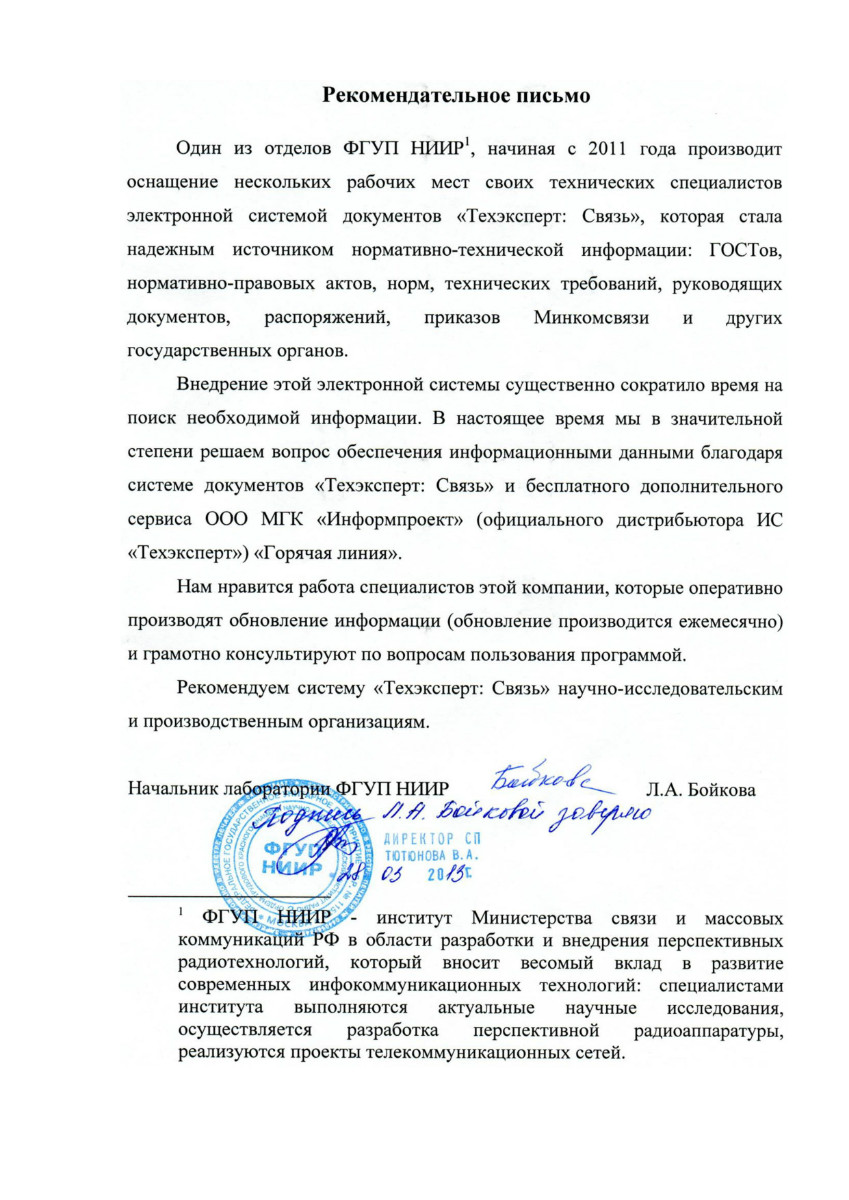ФГУП «НИИР», г. Москва, начальник лаборатории Л.А. Бойкова: