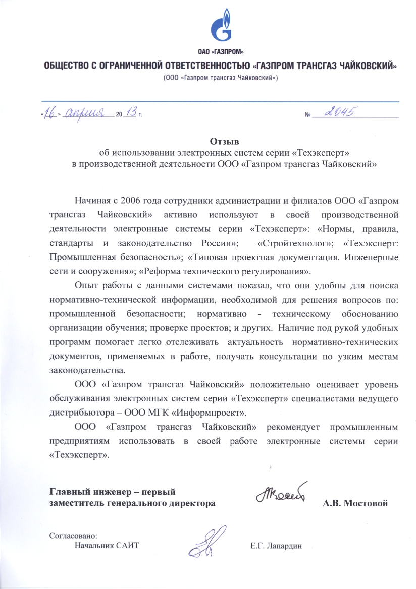 ООО «Газпром трансгаз Чайковский», главный инженер – первый заместитель генерального директора А.В. Мостовой