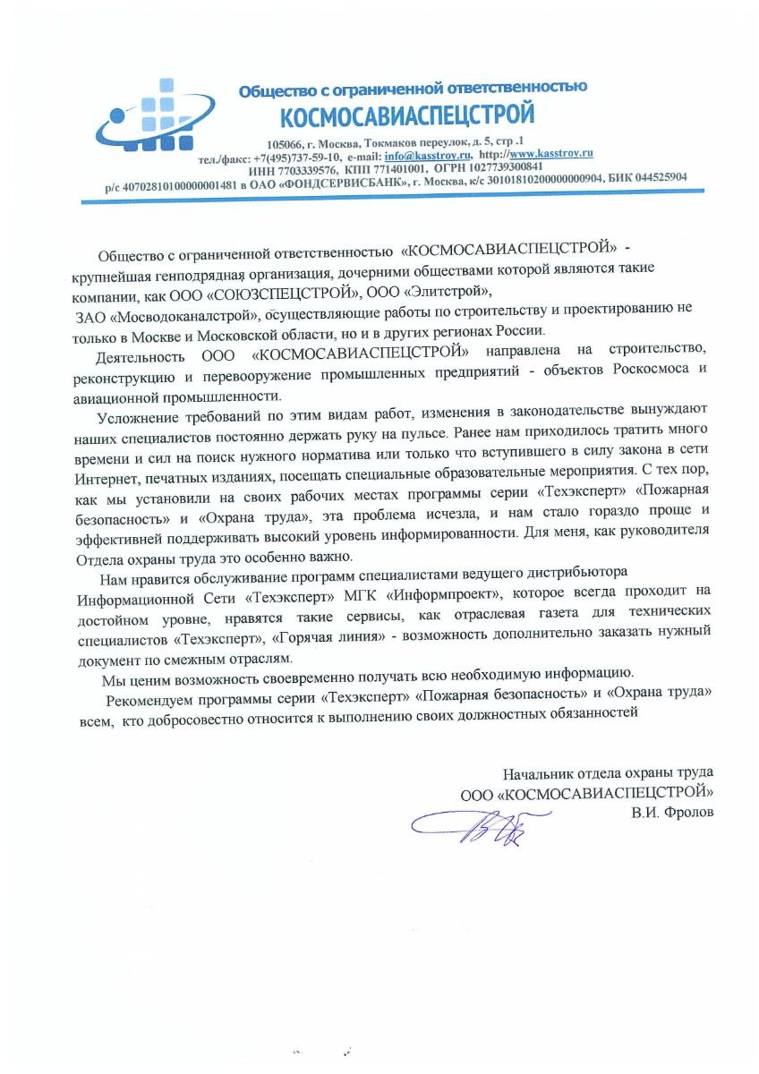 ООО «КОСМОСАВИАСПЕЦСТРОЙ», г. Москва, начальник отдела охраны труда В.И. Фролов: