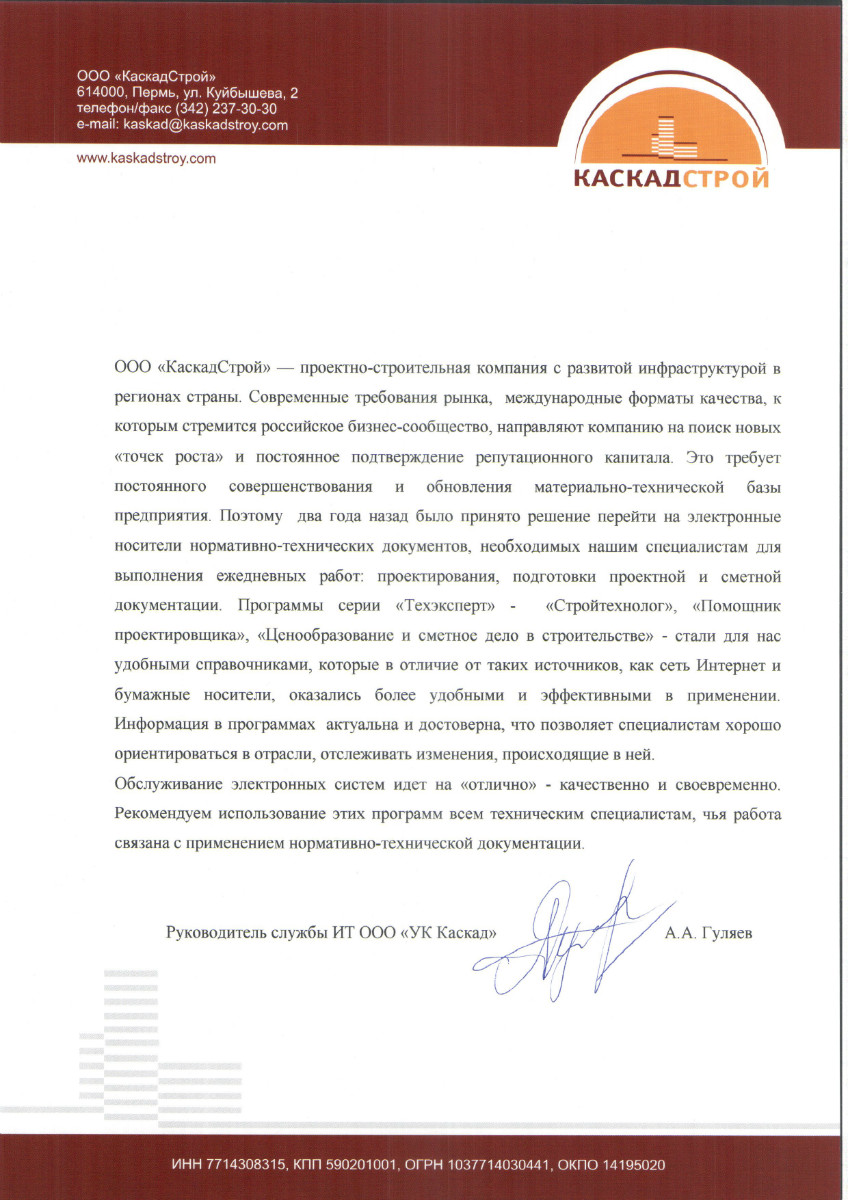 «Мы заботимся о своей репутации, ценим свое время и стремимся повышать эффективность всех рабочих процессов компании, поэтому программы серии «Техэксперт» стали для нас надежным источником нормативно-технических документов, необходимых для реализации строительных проектов любой сложности».