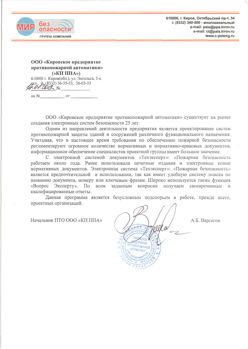 ООО «Кировское предприятие противопожарной автоматики», г. Киров, начальник ПТО А.Б. Варсегов: