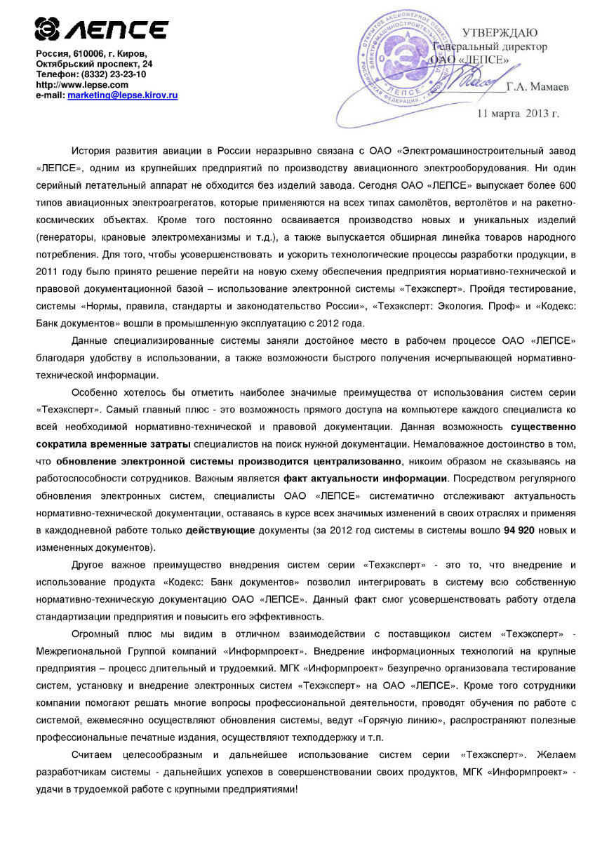 «Особенно хотелось бы отметить наиболее значимые преимущества от использования систем серии «Техэксперт». Самый главный плюс - это возможность прямого доступа на компьютере каждого специалиста ко всей необходимой нормативно-технической и правовой документации. Данная возможность существенно сократила временные затраты специалистов на поиск нужной документации. Немаловажное достоинство в том, что обновление электронной системы производится централизованно, никоим образом не сказываясь на работоспособности сотрудников. Важным является факт актуальности информации. Посредством регулярного обновления электронных систем, специалисты ОАО «ЛЕПСЕ» систематично отслеживают актуальность нормативно-технической документации, оставаясь в курсе всех значимых изменений в своих отраслях и применяя в каждодневной работе только действующие документы (за 2012 год системы в системы вошло 94 920 новых и измененных документов)».