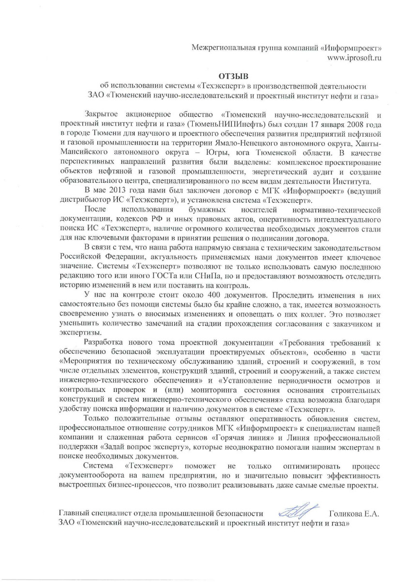 «Использование ЭС «Техэксперт» для нас очень актуально, так как постоянно находимся под проверками контролирующих органов. Системы очень помогают в работе (жилищное проектирование) – используем нормативно-техническую документацию из «Техэксперта» Особенно удобно отслеживать все новинки в продуктах, и тем более в законодательстве!»