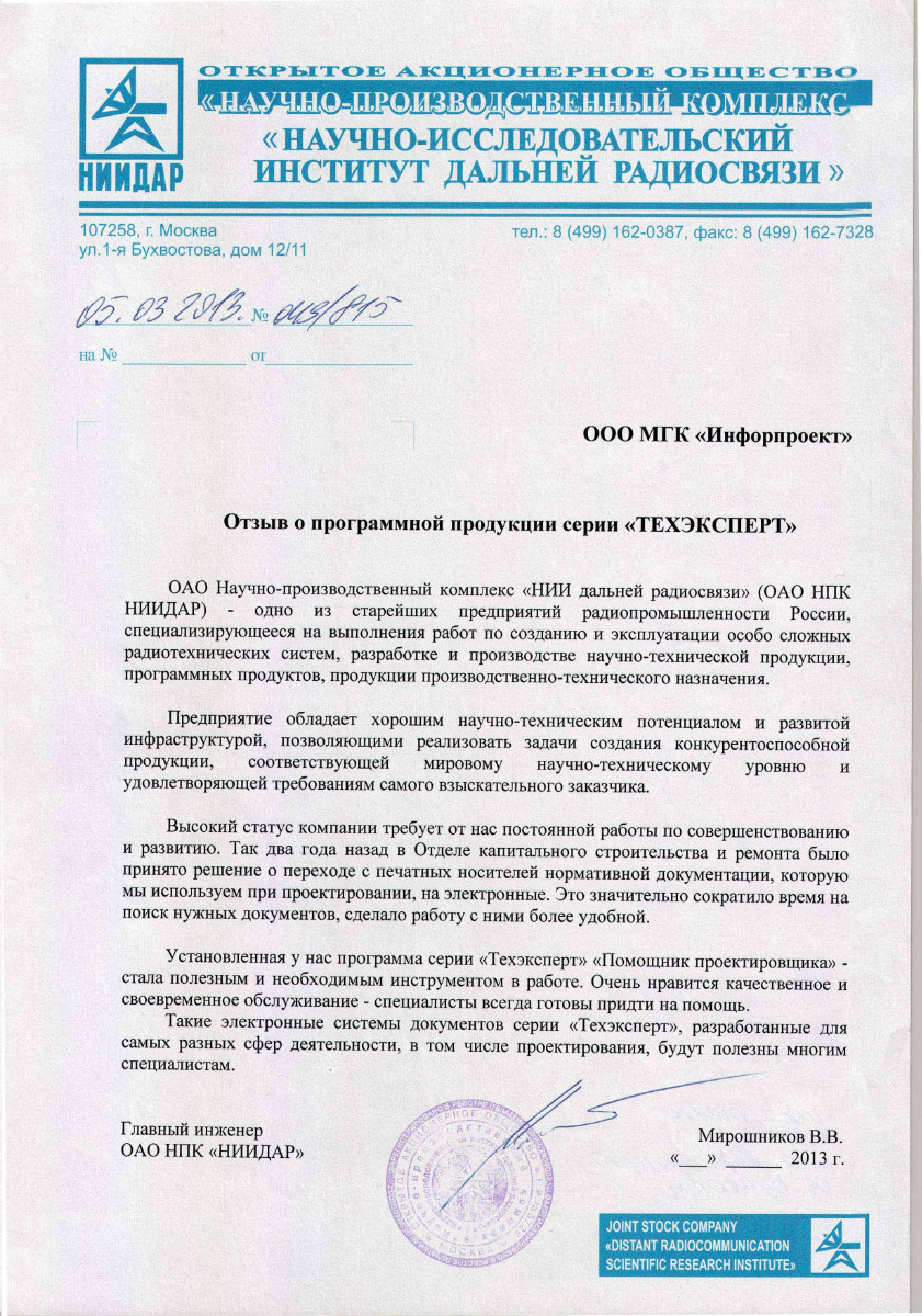 ОАО «Научно-производственный комплекс «Научно-исследовательский институт дальней радиосвязи», г. Москва, главный инженер В.В. Мирошников:
