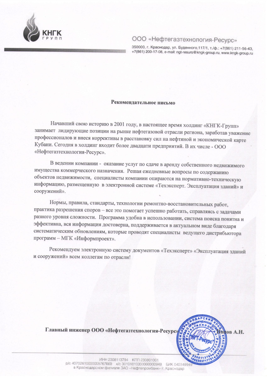 «В ходе ведения проектных и строительных работ наше предприятие использует для поиска нужных нормативов электронные системы серии «Техэксперт». Очень важно при выборе решений в сложных ситуациях оперативно находить нужный нормативный документ и сведения о нем, в частности, статусе, позволяющем узнать, действует этот норматив или отменен (заменен новым). Особенно это выручает при проведении экспертизы проектной документации».