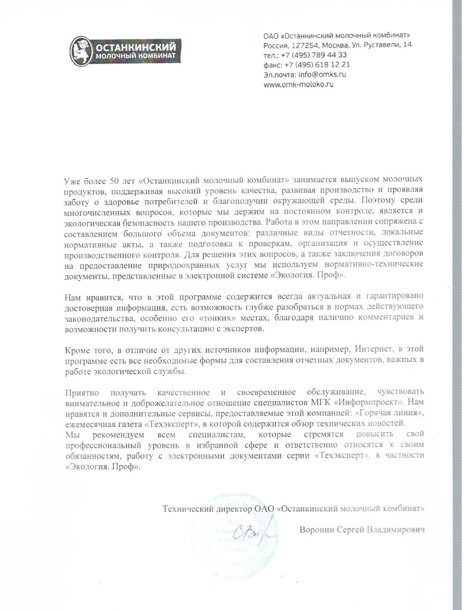 ОАО «Останкинский молочный комбинат», г. Москва, технический директор С.В. Воронин: