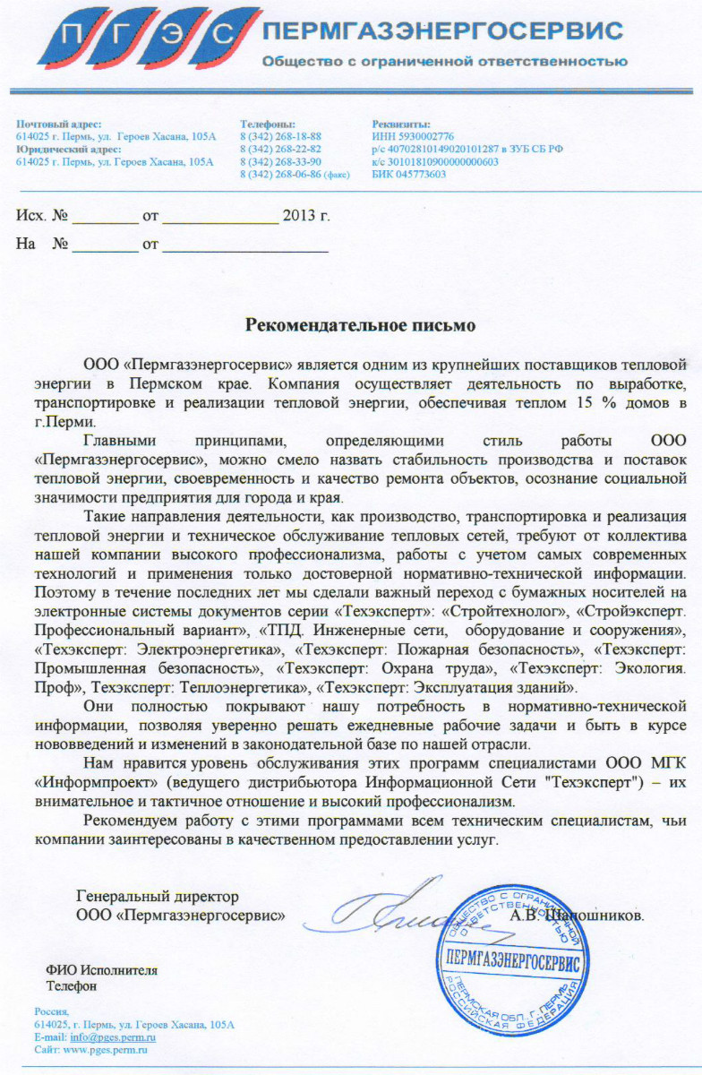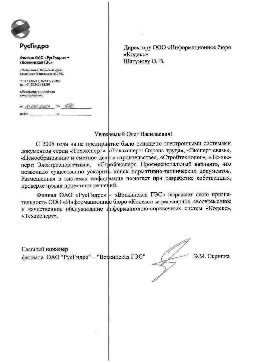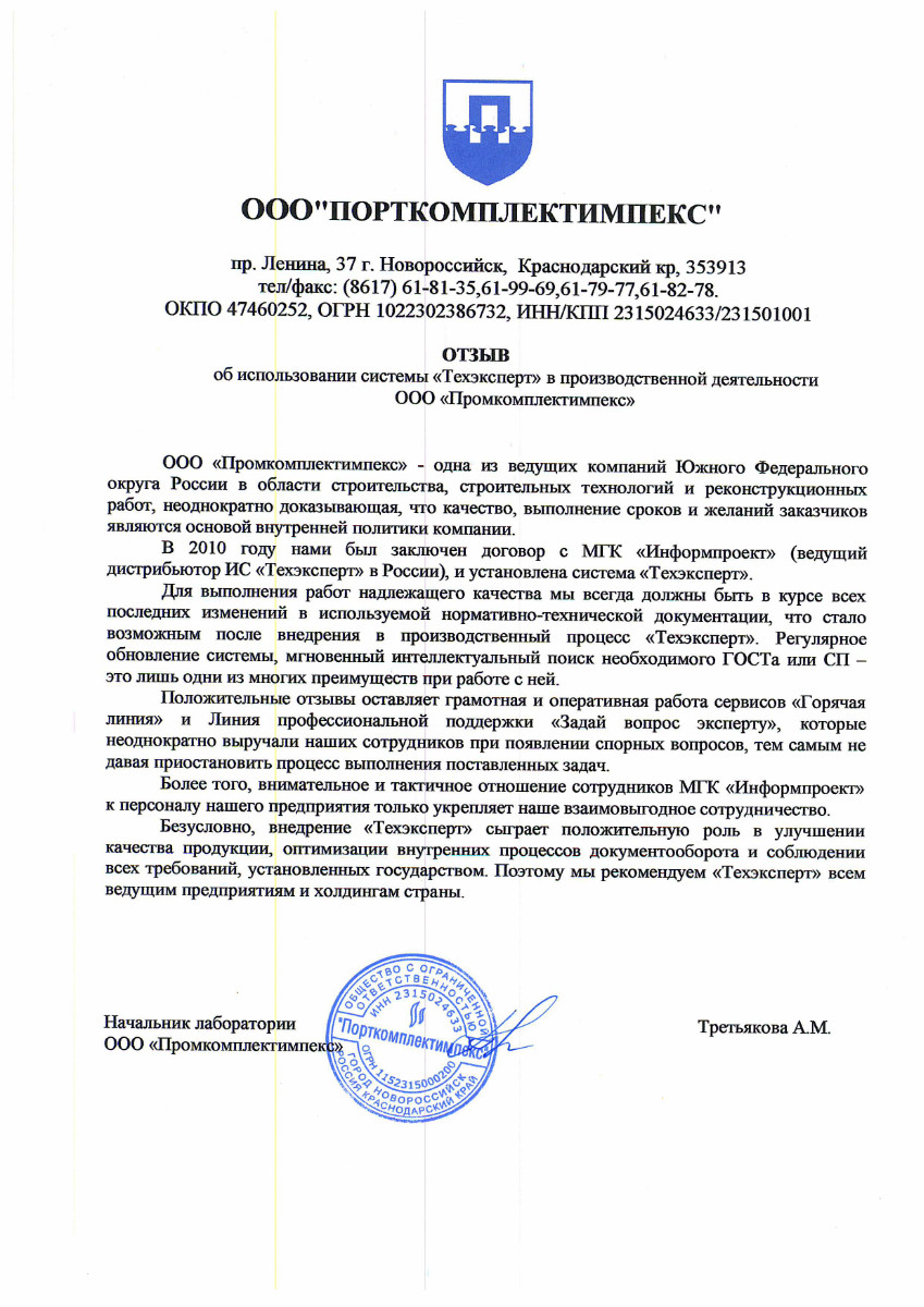 «Уже более двух лет назад руководство компании приняло решение оснастить рабочие места технических специалистов программами «Стройэксперт. Вариант Лидер», «Стройтехнолог», «Техэксперт: Газовый комплекс», «Техэксперт: Электроэнергетика», «Техэксперт: Экология Проф», «Техэксперт: Охрана труда», «Указатель стандартов России». Их наличие значительно облегчает поиск нужных документов, содержащихся в нормативной базе Российской Федерации, помогает в составлении проектов производства работ и др. Теперь мы полностью покрываем нашу потребность в нормативно-технической информации».