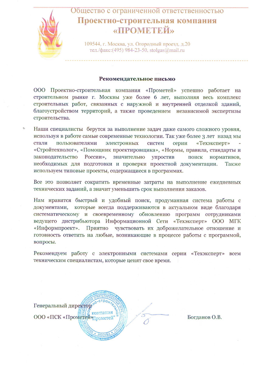 ООО «Проектно-строительная компания «Прометей», г. Москва, генеральный директор ООО «ПСК «Прометей» О.В. Богданов: