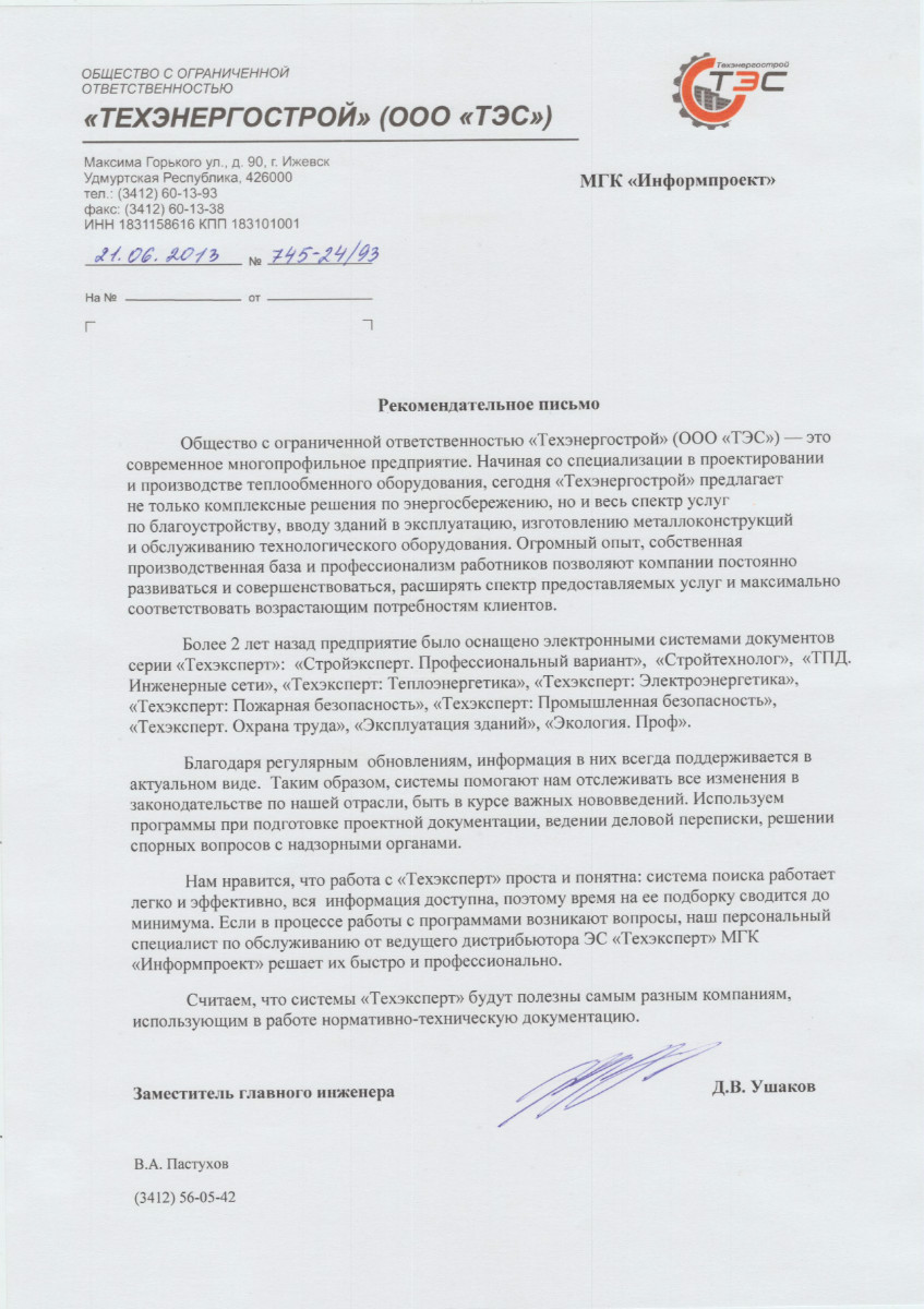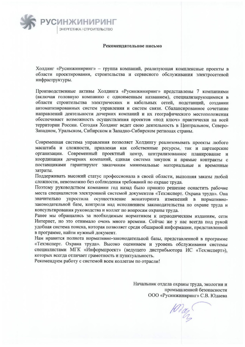 «Программа очень помогает в работе, так как постоянно нужны обновления (в работе используем только актуальные документы). Также «Техэксперт» помогает в оформлении различного рода документации».