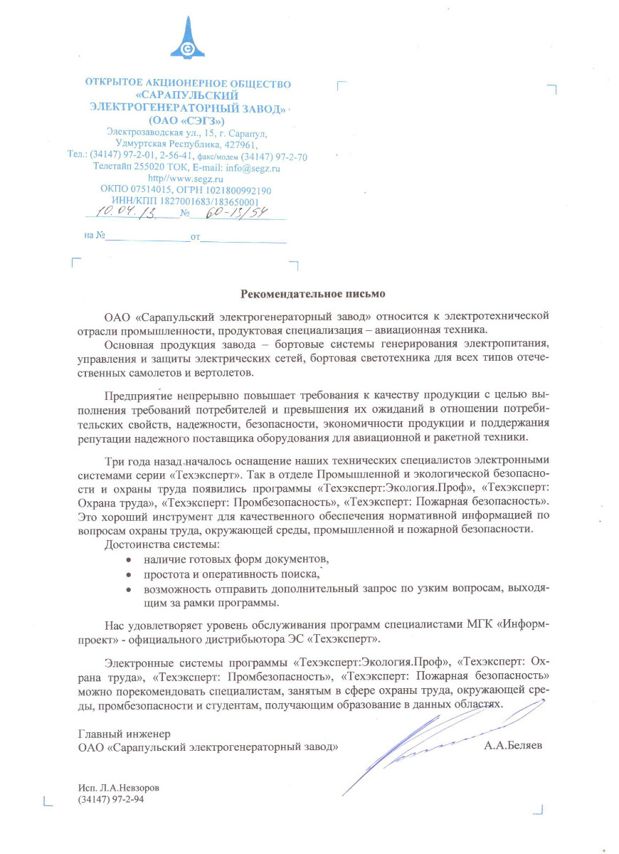 ОАО «Сарапульский электрогенераторный завод», г. Сарапул, главный инженер А.А. Беляев