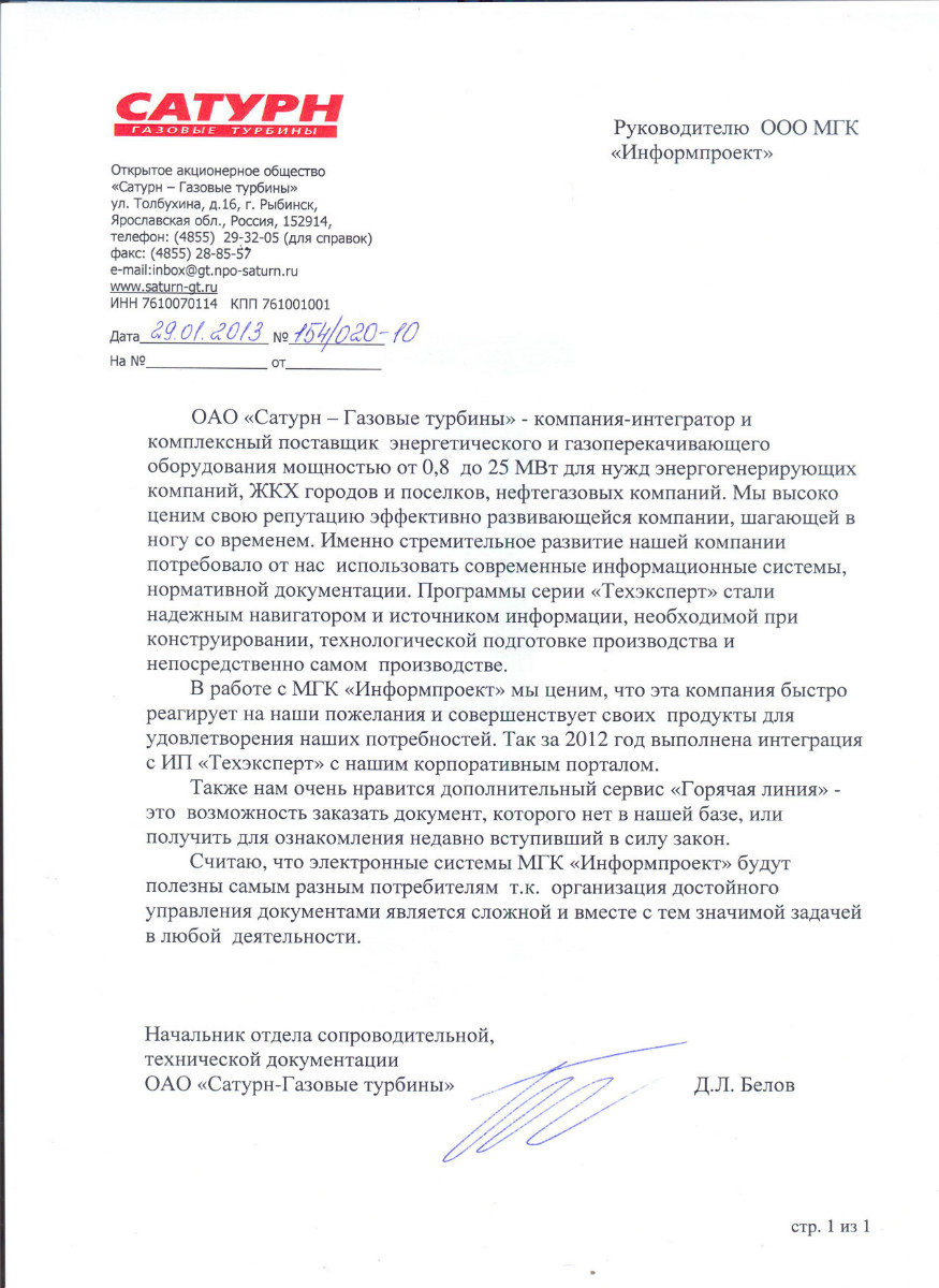 ОАО «Сатурн – газовые турбины», г. Ярославль, начальник отдела сопроводительной технической документации Д.Л. Белов: