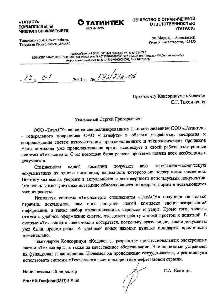 Используя системы «Техэксперт», специалисты «ТатАСУ» получили не только перечень документов, нам стал доступен целый комплекс специализированной информации, а также набр предоставляемых сервисов и услуг».