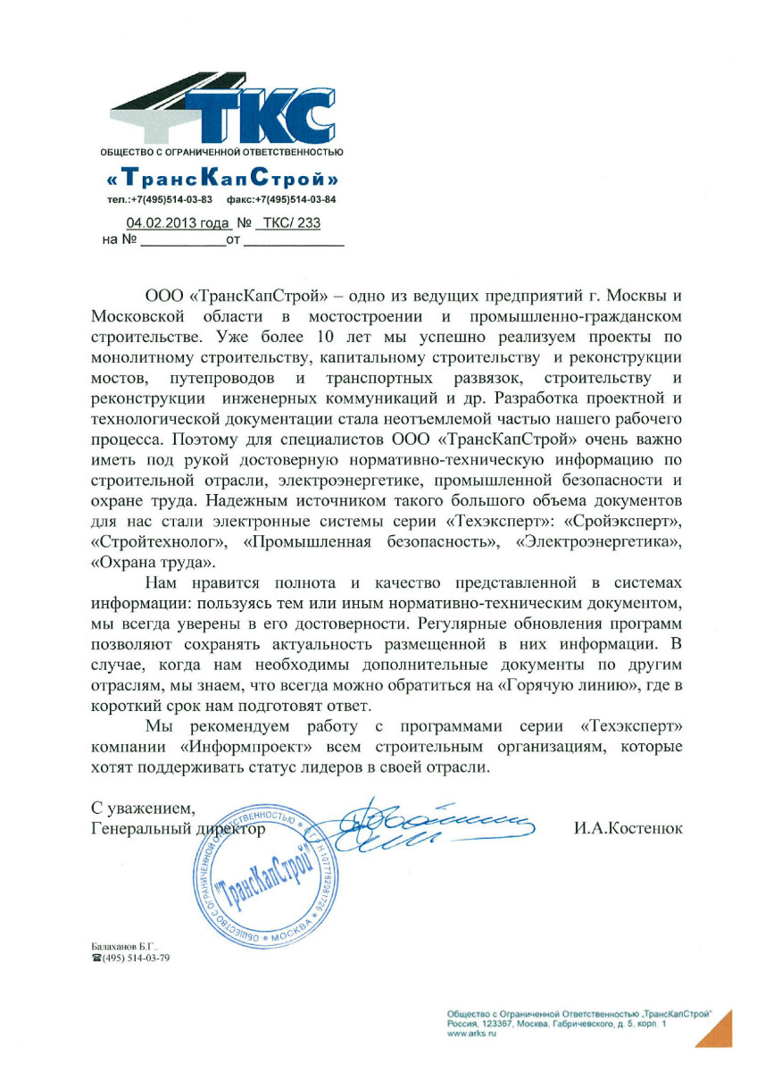 ООО «ТрансКапСтрой», г. Москва, генеральный директор И.А. Костенюк: