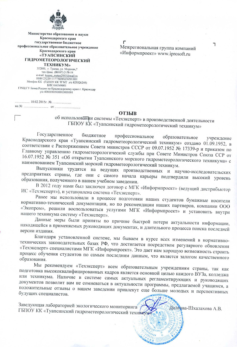 «Преподаватели университета следят за всеми изменениями в отраслях промышленности, в том числе и появлением новых нормативно-технических документов через программы серии «Техэксперт» - «Экология. Проф» и «Нормы. Правила. Стандарты». Своевременное и качественное обслуживание этих электронных систем специалистами МГК «Информпроект» обеспечивает высокий уровень достоверности и актуальности информации».