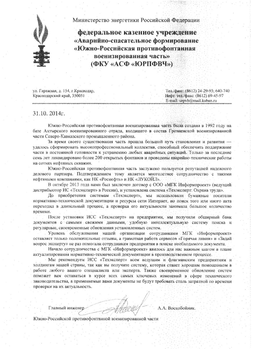 «Электронная система «Техэксперт: Пожарная безопасность» является предпочтительной в использовании, так как имеет удобную систему поиска по названию документа, номеру и ключевым фразам. Широко используется также функция «Вопрос эксперту». По всем заданным вопросам получаем своевременные и квалифицированные ответы».