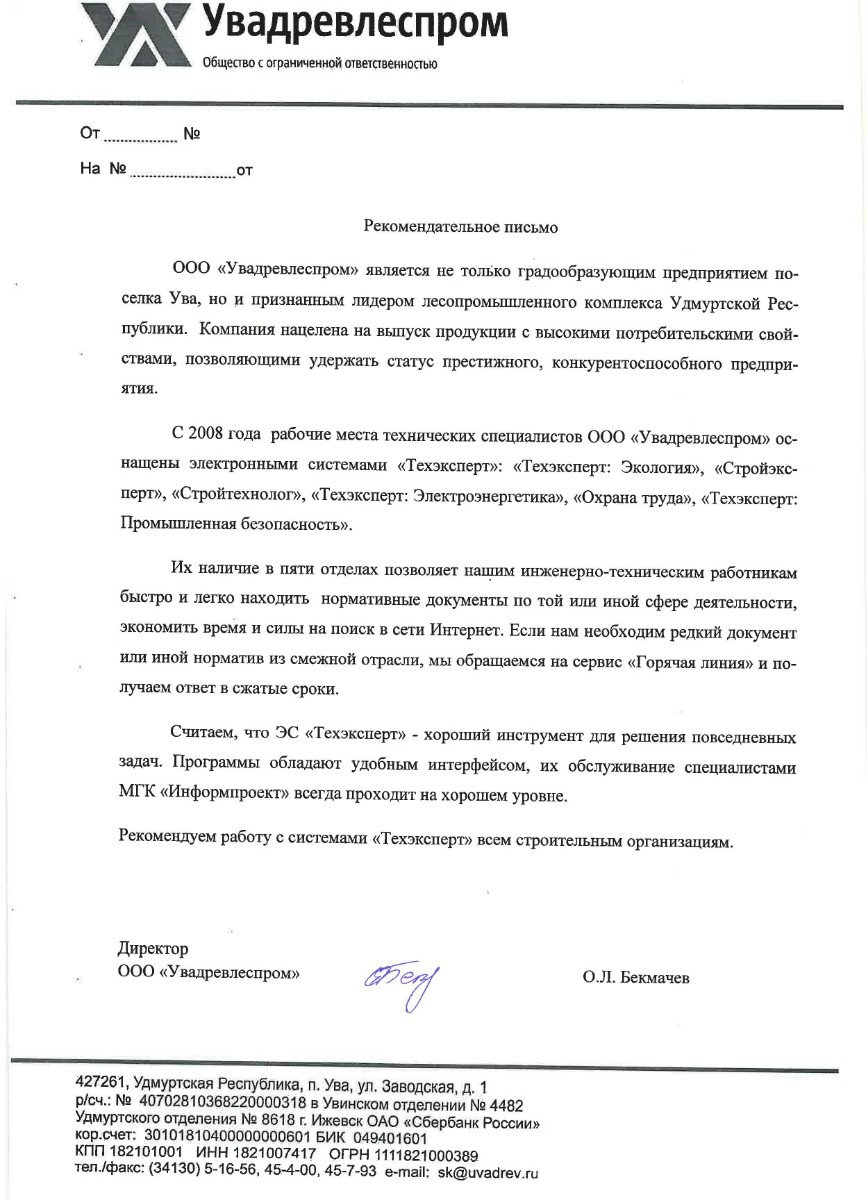 ООО «Увадревлеспром», директор О.Л. Бекмачев