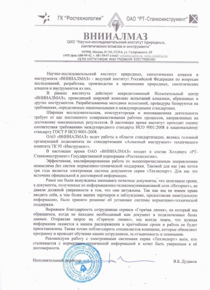 ОАО «Научно-исследовательский институт природных, синтетических алмазов и инструмента», г. Москва, исполнительный директор Б.Д. Дудаков: