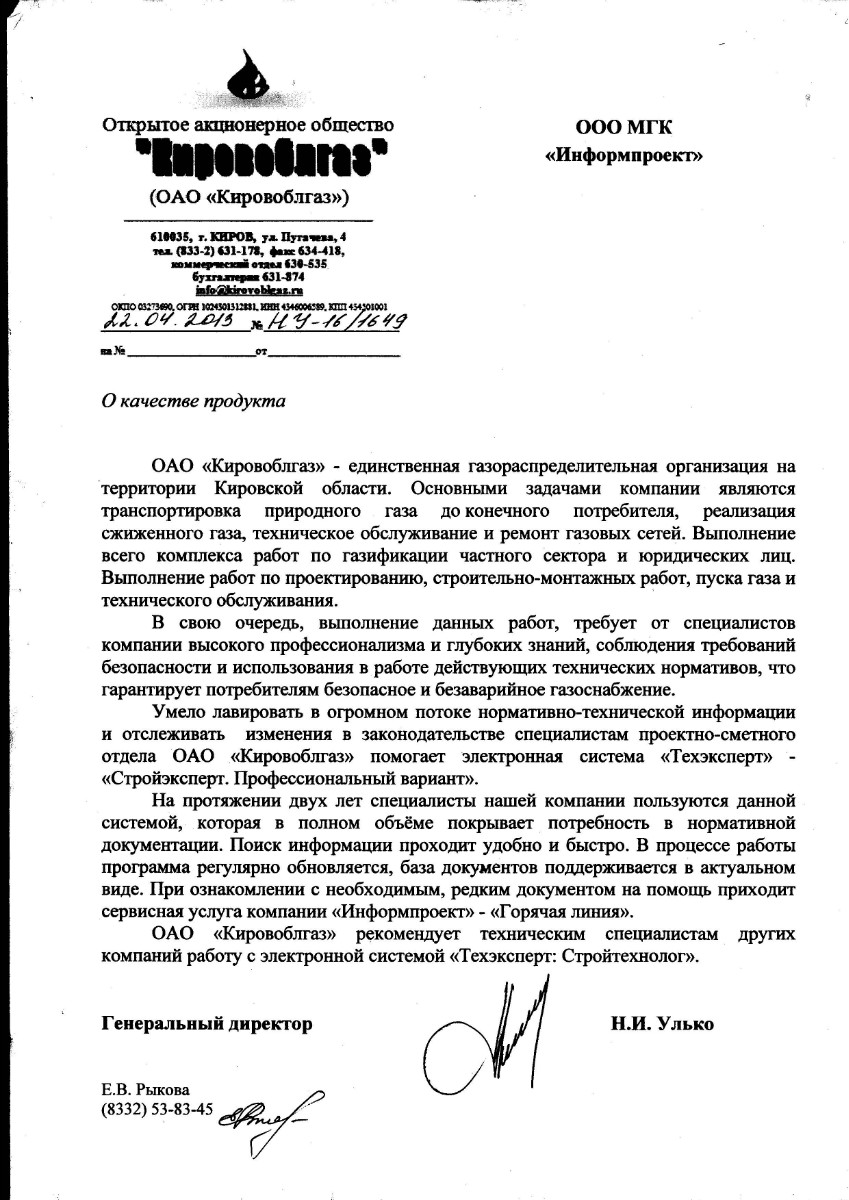 «Умело лавировать в огромном потоке нормативно-технической информации и отслеживать изменения в законодательстве специалистам проектно-сметного отдела ОАО «Кировоблгаз» помогает электронная система «Техэксперт» - «Стройэксперт. Профессиональный вариант».