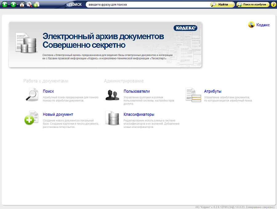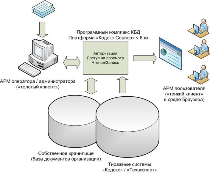 Система позволяет объединить в единое информационное поисковое пространство документы организации и документы из тиражных продуктов «Кодекс» и «Техэксперт» (Intranet-вариант), если организация является пользователем этих продуктов.