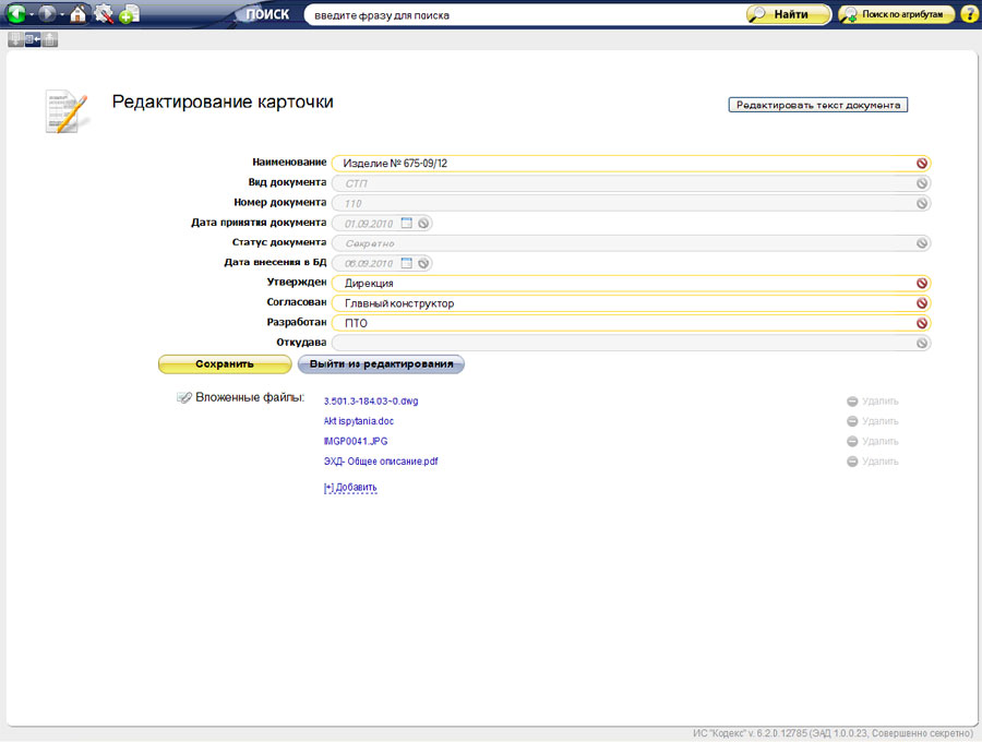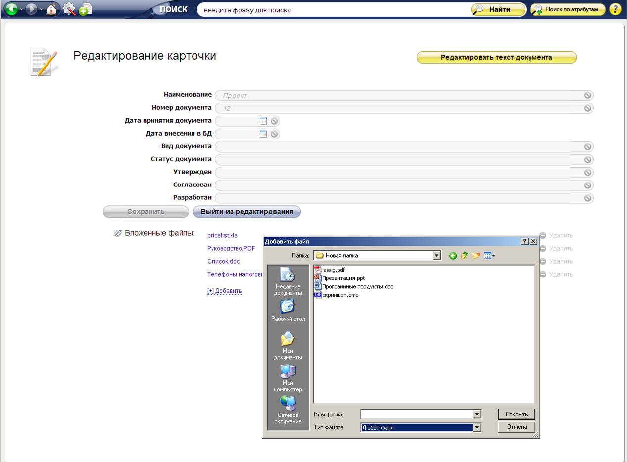 - Загрузка документов в форматах RTF, TXT, DOC, DOCX, а также хранение любых типов файлов в виде вложений (JPG, GIF,TIFF,PDF,DWG, файлов мультимедиа и т.п.);