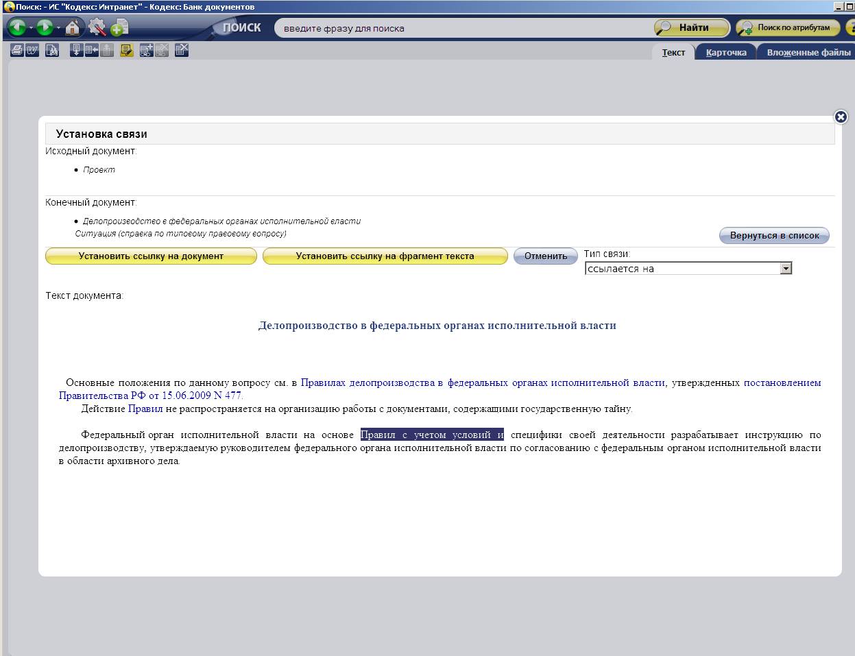 - Простановка гиперсвязей между документами (в том числе и на документы из тиражных продуктов «Кодекс» и «Техэксперт»);
