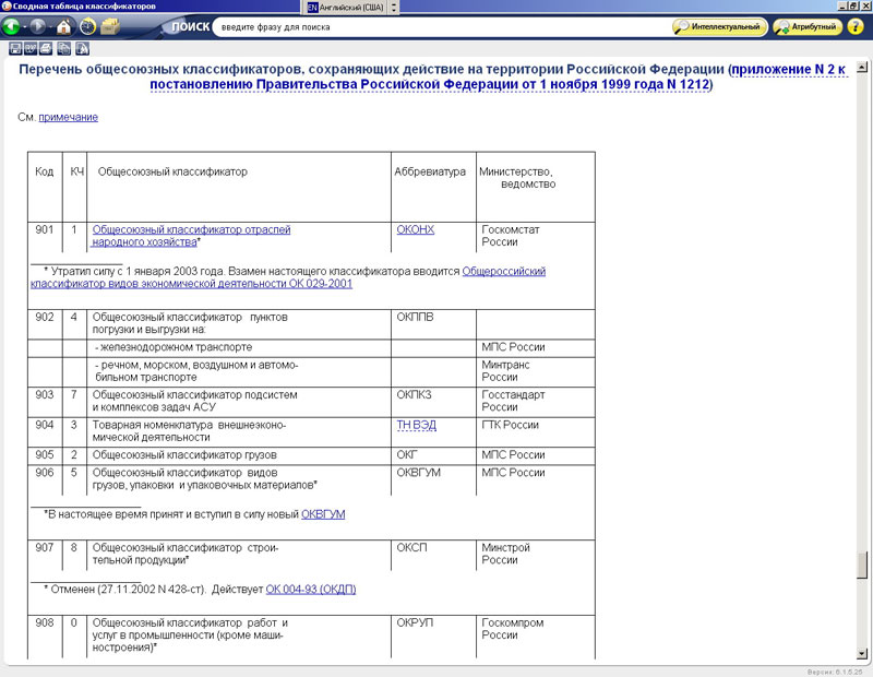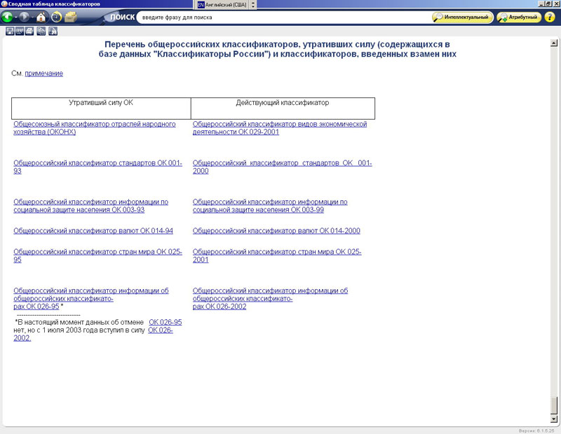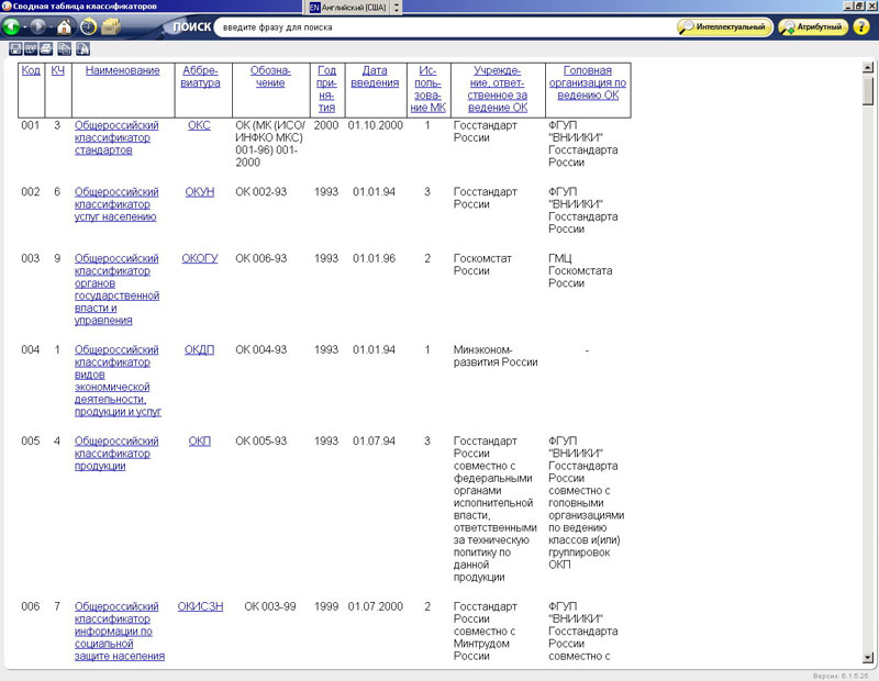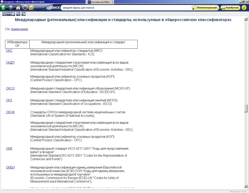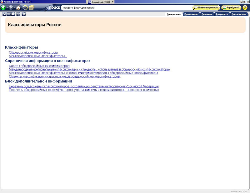 «Классификаторы России» - справочная система, содержащая общероссийские и межгосударственные классификаторы. Использование классификаторов технико-экономической и социальной информации, представленных в системе, способствует решению проблемы унификации межведомственных потоков информации, номенклатур и классификаторов, используемых различными органами управления и международными организациями. Все классификаторы разделены на группы в соответствии с видами информации.
